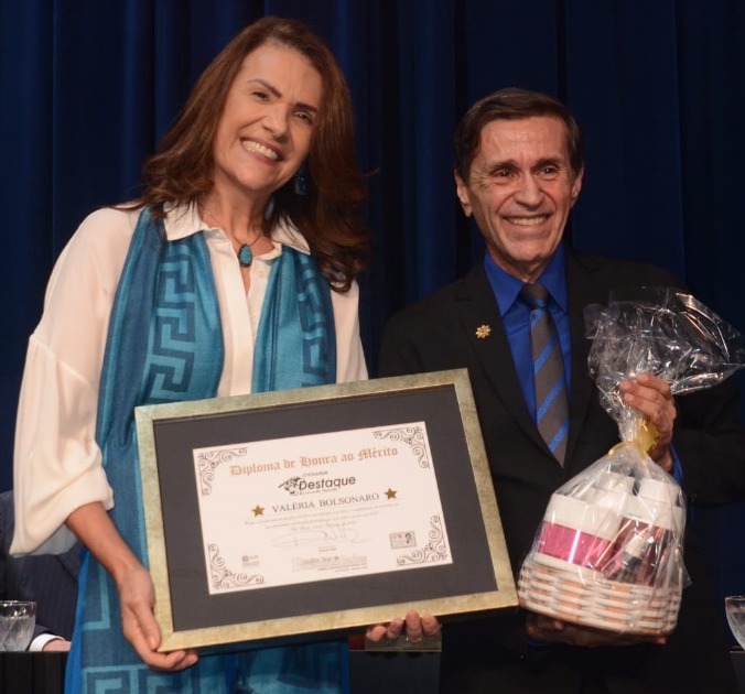 A Coluna Destaque Raimundo Nonato, realizou com grande sucesso, a 45ª Edição do Prêmio Personalidade Brasil 2025. Foto legenda: Valéria Bolsonaro recebendo de Raimundo Nonat, sua homenagem da Coluna Destaque de Personalidade Brasil 2025 - Créditos Jackson Marques / Jorge Henrique - Fotógrafo das Estrelas.