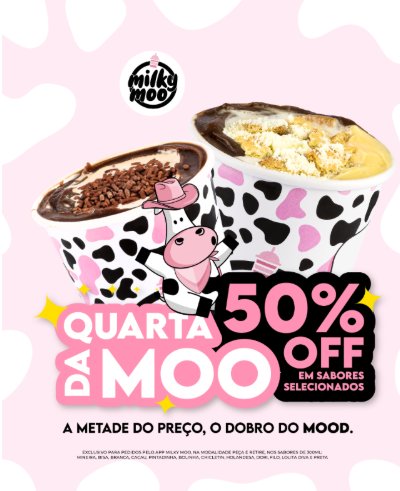 Quarta-feira ganha novo significado para os fãs da Milky Moo com o lançamento da Quarta da Moo, ação semanal que oferece 50% de desconto em 13 sabores do aplicativo da marca, incluindo Bisa, Branca, Cacau, Pintadinha e Diva. A promoção faz parte do programa de fidelidade Clube Moo, incentivando pedidos recorrentes e aproximando os usuários do app como principal canal de contato com a marca.