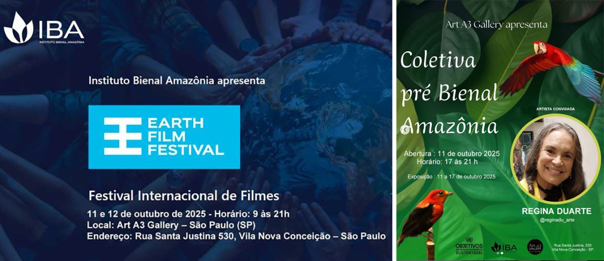 IBA - Instituto Bienal Amazonia, Saphira Ventura Media & Entertainment e Arte A3 Gallery apresentam em São Paulo, nos dias 11 e 12 de outubro, o Earth Film Festival — EFF, um festival internacional dedicado à arte, ao ativismo e à consciência ambiental, que une cinema, inovação e sustentabilidade em uma mesma experiência, com apoio New York International Contemporary Art Society (NYICAS) / IBA/ ODS Amazonia/ IBAMA - Stylos Galeria. O evento conta com produção executiva de Alcinda Saphira, da Saphira & Ventura Gallery (Nova York), e co-curadoria de Rosita Cavenaghi em São Paulo. As atividades se estendem até 31 de novembro de 2025, com apresentações em Rio de Janeiro, São Paulo, Brasília e Belém. Segundo Rosita, o Earth Film Festival nasce no coração da Amazônia com a missão de ser uma plataforma criativa para amplificar narrativas climáticas urgentes, inspirando novas perspectivas e soluções diante dos desafios sociais e ambientais globais. “Mais do que um evento, o EFF é um movimento cultural e educacional que celebra cineastas visionários, promove diálogos e conecta pessoas em torno de um futuro mais sustentável”, destaca a curadora. De 11 a 17 de outubro também haverá uma exposição de arte, coletiva pré-bienal Amazonia.