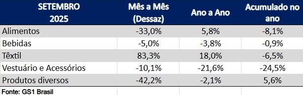 Entre os demais segmentos, apenas alimentos apresentaram alta anual (5,8%), porém com queda de 33% em setembro comparado a agosto. Outros setores como bebidas, vestuário e produtos diversos também tiveram queda no período, conforme quadro abaixo.